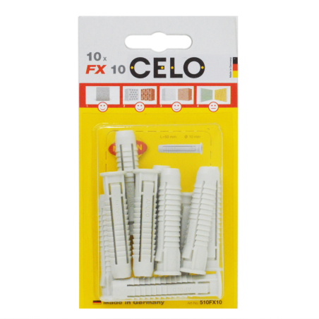 A népszerű CELO FX dűbel négyirányú tágulása nagyon magas terhelhetőségi értékeket biztosít a különféle építőanyagokban. Bordázata megakadályozza az elforgást a furatban. A fejrészen levő gallérnak köszönhetően nem csúszik be a furatba. Az FX dűbel kiváló minőségű, öregedésálló nylonból készül. Különböző típusú csavarokkal használható, mint például fa-, forgácslap-, önmetsző csavarok, stb. -40 °C és +80 °C között hőálló. Az FX dűbel széles körű felhasználhatóságot tesz lehetővé.
