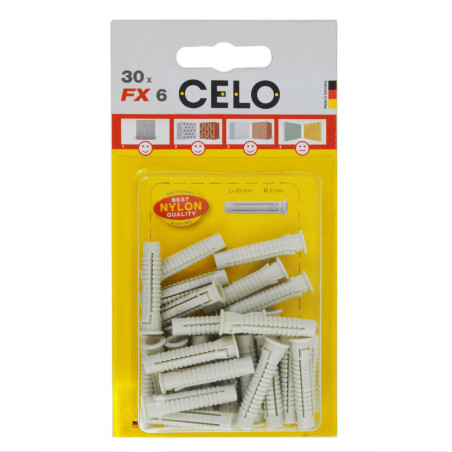 A népszerű CELO FX dűbel négyirányú tágulása nagyon magas terhelhetőségi értékeket biztosít a különféle építőanyagokban. Bordázata megakadályozza az elforgást a furatban. A fejrészen levő gallérnak köszönhetően nem csúszik be a furatba. Az FX dűbel kiváló minőségű, öregedésálló nylonból készül. Különböző típusú csavarokkal használható, mint például fa-, forgácslap-, önmetsző csavarok, stb. -40 °C és +80 °C között hőálló. Az FX dűbel széles körű felhasználhatóságot tesz lehetővé.