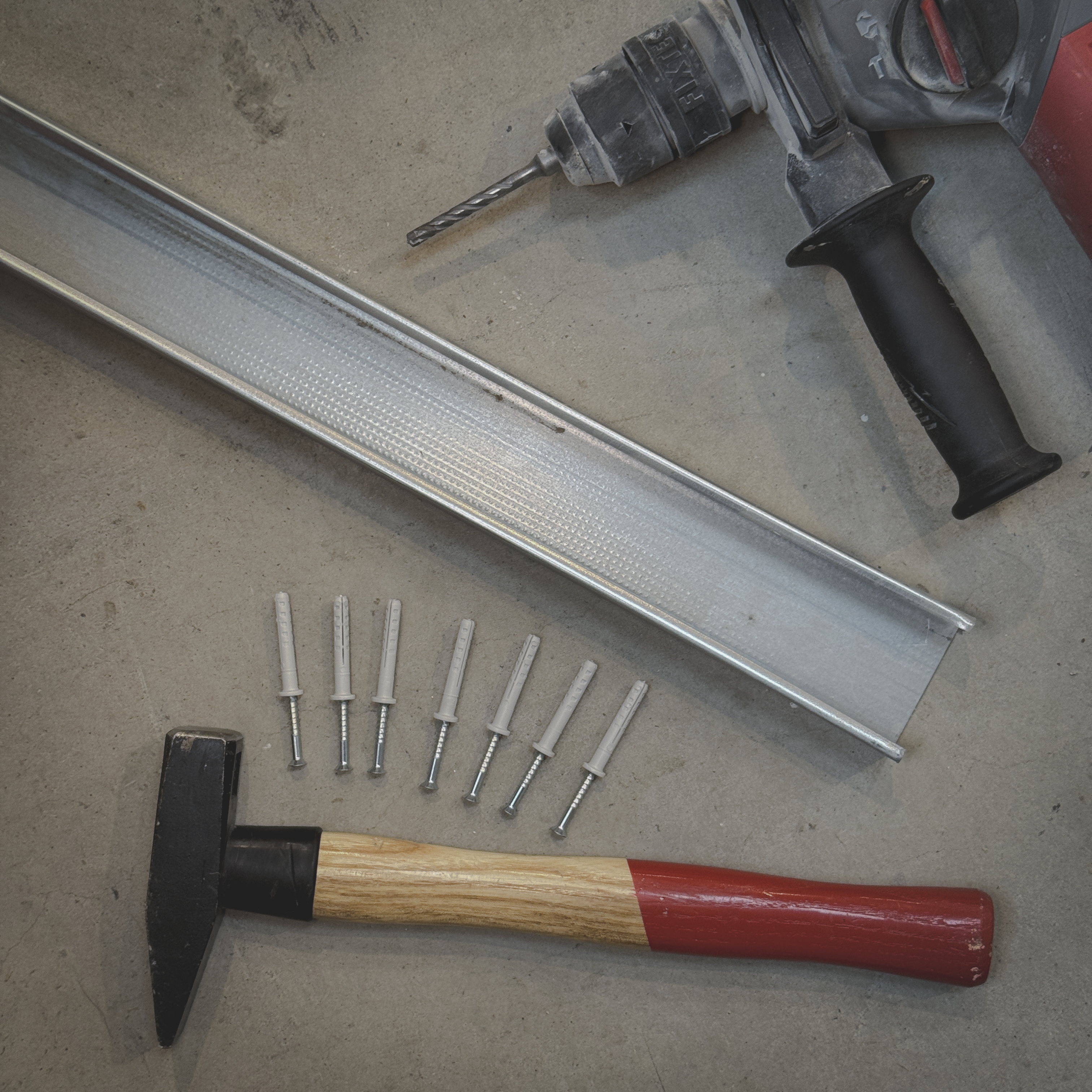Ehhez egy ütvefúró segítségével készítünk 6⌀ furatokat, elhelyezzük a 6/40-es beütődübelt, majd egy kalapáccsal rögzítjük a betonban.